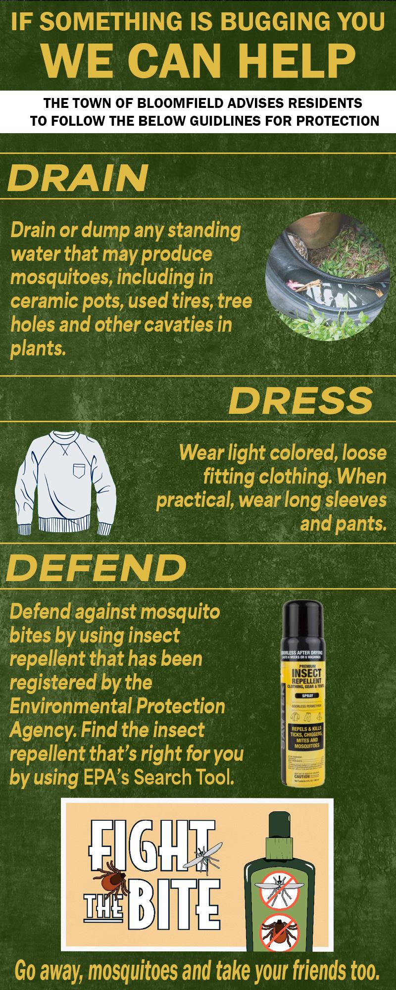 The West Hartford Bloomfield Health District provides information regarding Mosquito Control, which primarily focuses on preventive efforts by identifying and treating mosquito breeding sites, and community education about personal protection and how to minimize mosquitoes around the home. Throughout the year, Health Sanitarians monitor and investigate complaints and conduct mosquito surveillance stemming from public concern.